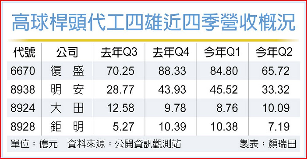 許廷儀預估,復盛今年第二季和第三季將是營收谷底,第四季旺季起飛,全年營收將呈現U字型格局,第四季甚至有機會創下今年營收最高的季度,可望優於去年第四季一些。除龍頭復盛,另外三家高球桿頭代工企業明安(8938)、大田(8924)和鉅明(8928)今年第四季也都將重回旺季的軌道。