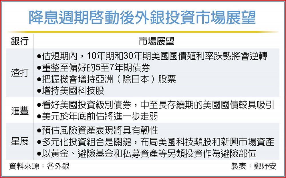 美國聯準會(Fed)在近期的決策上符合市場預期,且在非衰退環境下降息,有利風險資產表現,但聯準會與市場對2026年的降息預期差距較大,可能將導致美國債券殖利率上行的風險。多數外銀看好美國投資級債,並且偏好5年至7年期債券,股市建議視機會增持亞洲(除日本外)股票。