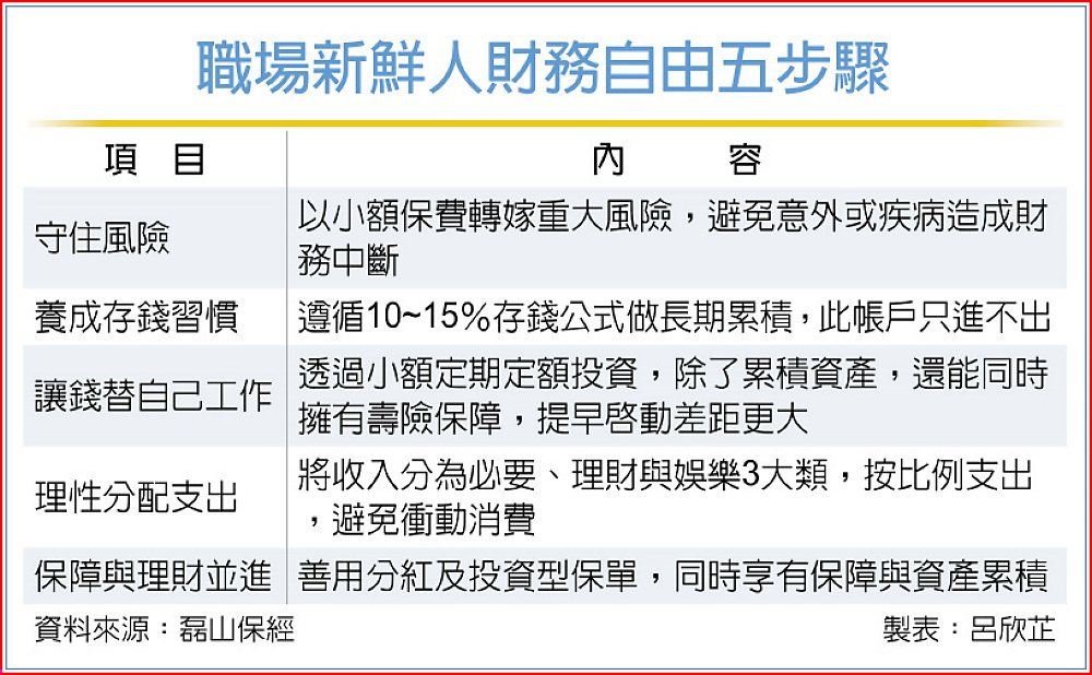 此外,保經業者強調,新鮮人若能把握「早開始、穩基礎、持續累積」三大原則,不僅能改善月光狀況,也能在職涯早期奠定財務自由的基礎。