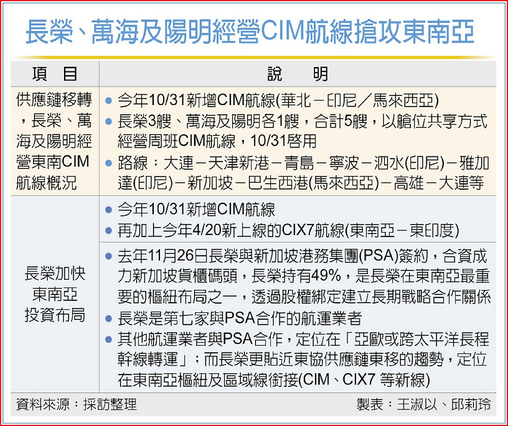 全球供應鏈東移,東南亞已躍為製造與出口重鎮。長榮近年積極加碼布局東協市場,與新加坡港務局(PSA)合資設立專屬碼頭,更連續推出多條新航線,且10月31日首度與萬海、陽明聯手,以艙位共享方式,周班經營CIM航線(華北-印尼/馬來西亞),再加上4月20日已上線的CIX7(東南亞-東印度)服務,全力搶攻供應鏈轉移的商機。