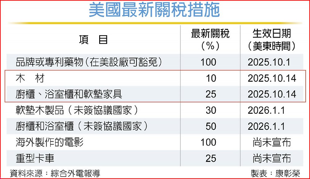 公告內容指出,關稅稅率訂於10月14日開始執行,並提到針對未能與美國達成協議的國家,自明年1月1日起,進口的軟墊木製品關稅將調高至30%,廚櫃和浴室櫃的關稅則會上調至50%。