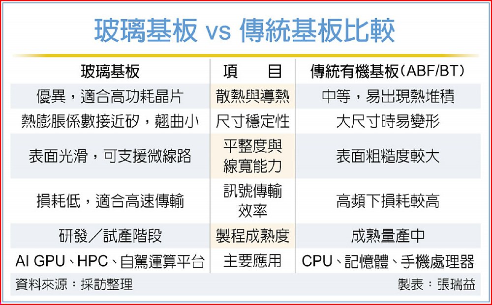 半導體設備廠表示,玻璃基板之所以受到矚目,關鍵在於其在散熱、導熱與平整度等面向優勢。傳統有機材料在晶片尺寸擴大時容易出現翹曲與熱應力問題,而玻璃基板則能大幅降低變形風險,對於日益大型化、高功率化的晶片封裝需求尤其重要。