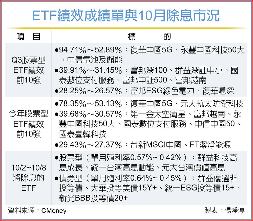 根據統計,今年、第三季以來海外股市表現多領先於台股。第三季績效冠軍為復華中國5G,單季就大漲了94.71%,永豐中國科技50大上漲57.39%,中信電池及儲能、富邦深100等紛紛上漲超過3成以上;台股方面,雖然台積電第三季上漲23.11%,不過績效榜並非全由高含「積」ETF獨霸,居前的野村臺灣新科技50、國泰台灣科技龍頭、永豐智能車供應鏈、中信小資高價30、中信上櫃ESG 30、主動統一台股增長等,台積電占成份股比重僅在3成以下,而單季績效則在20%以上,打敗大盤的16.02%漲幅表現。