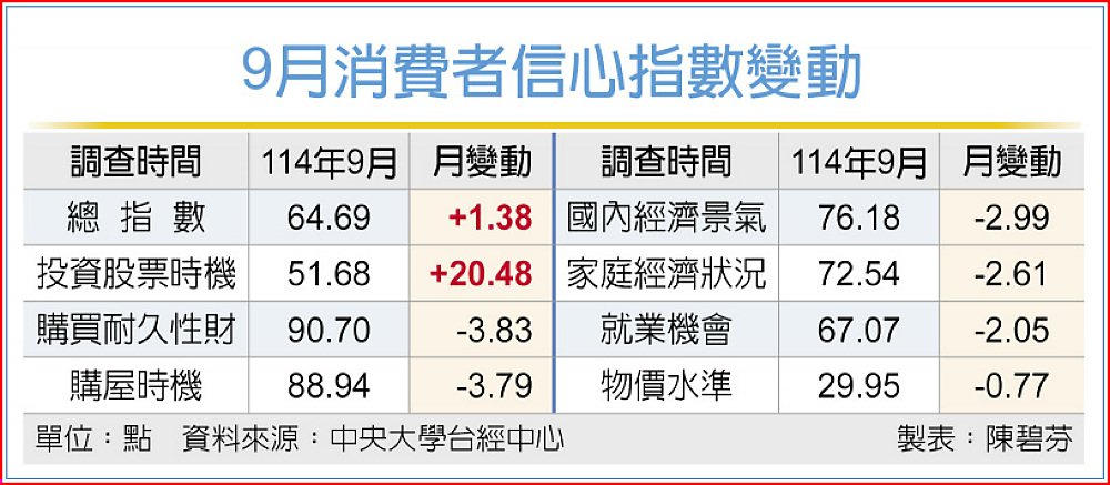 民眾的消費信心「標的」出現轉折。中央大學台灣經濟發展研究中心30日發布9月台灣消費者信心指數(CCI)調查結果,總指數為64.69點,單月上升1.38點,推升力道全部來自投資股票時機指標,本月上升幅度多達20.48點,來到51.68點,達到今年的最高點