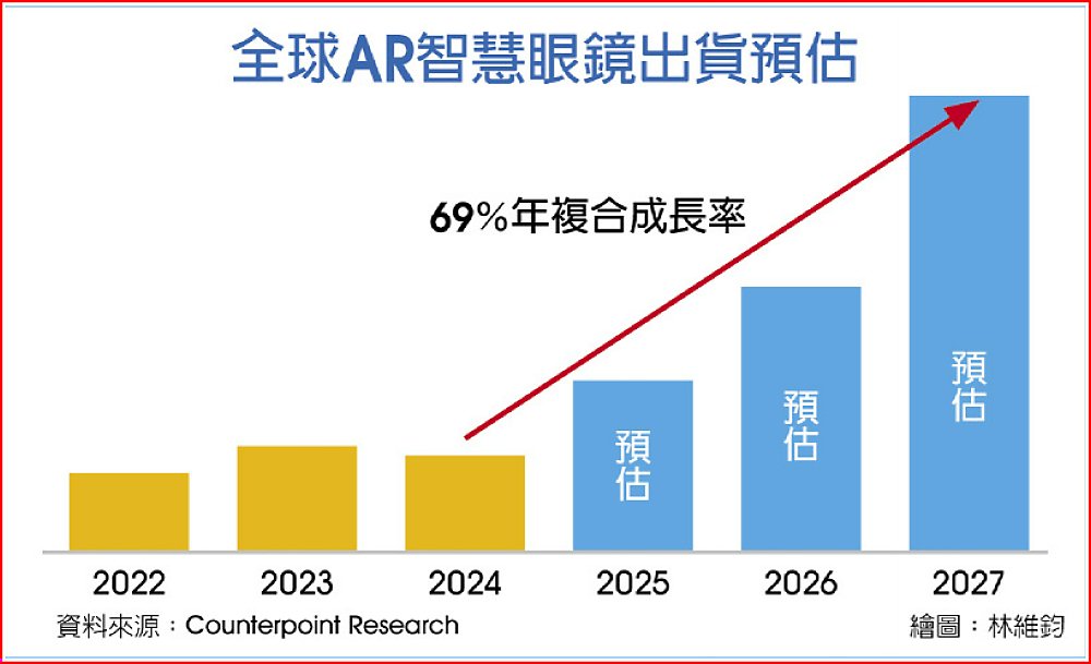 研調機構Counterpoint Research看好「AR+AI」的新應用,將在國際OEM與ODM大廠積極投入下迎來快速增長,並推升全球AR智慧眼鏡市場在3年間以高達69%的CAGR(年複合成長率)上揚。