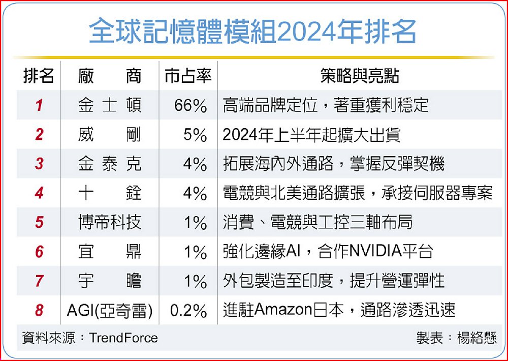 位居第二的威剛(3260)受惠於2023年中期備貨有成,在2024年上半年擴大出貨,全年營收成長20%;金泰克則透過海內外通路與掌握市場反彈契機,全年營收成長10%,排名第三。