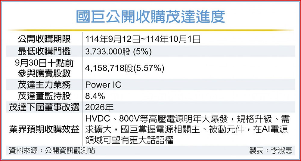 國巨統計,截至9月30日上午十時為止,累計應賣股數已超過最低收購數量3,733,000股,達4,158,718股,約當茂達股權比率5.57%,跨越最低收購門檻(5%),收購條件成就,國巨將持續公開收購茂達普通股至10月1日下午三時三十分止。