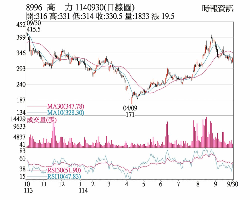 高力(8996)30日開盤後走高,終場收330.5元、上漲19.5元,成交量1,796張,自8月底創408元波段高點後,近月量縮修正,日前一度慣破上升季線,30日紅K重返5日、10日線、季線之上,KD指標低檔黃金交叉,籌碼上外資連四買,合計買超1,152張,惟量能稍不足,後續仍需出量才有利上攻。