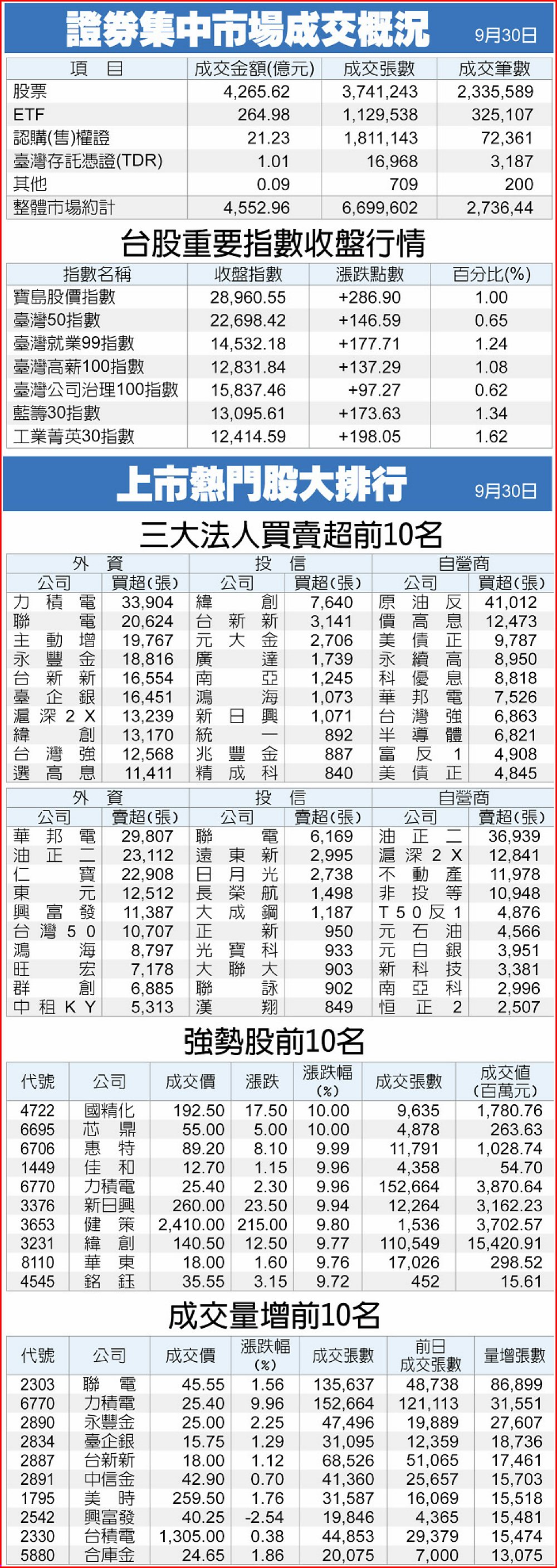 證券集中市場成交概況、上市熱門股大排行