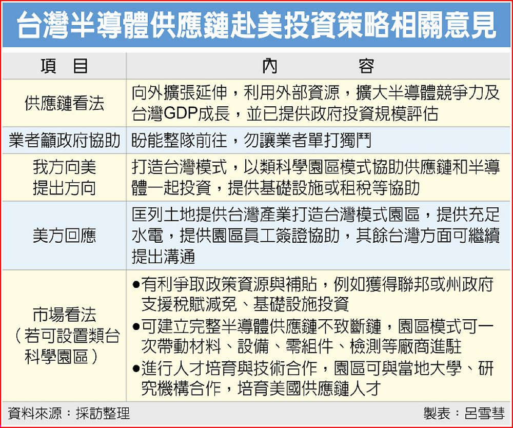 台灣水電及土地資源漸趨飽和,半導體產業認同政府對美承諾輸出設置「科學園區模式」經驗,「以大帶小」建立半導體供應鏈生態系。據悉,美方初步同意提供土地打造「台灣模式」,提供土地、水電及員工簽證,至於類台灣科學園區成功關鍵的「一站式服務管理」,有待與美方繼續洽談。