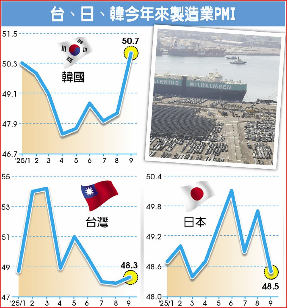 相較之下,身為亞洲第四大經濟體的韓國,9月製造業PMI指數從8月的48.3上升至50.7,自2025年1月來首度突破50榮枯關卡。泰國也與韓國一樣呈現更快速的擴張,而印尼保持在50分水嶺以上。(相關新聞見A4、A8)