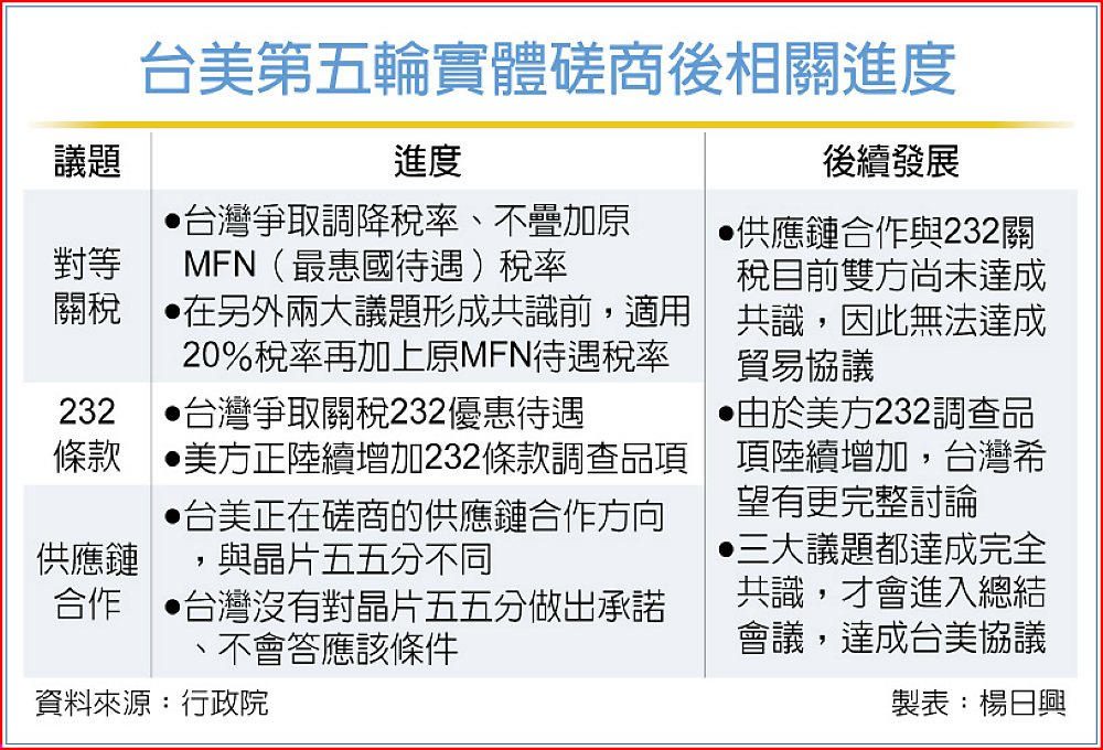 台美經貿工作小組指出,美方半導體關稅政策仍在發展,且232條款調查的品項還在陸續增加,我方也希望對232優惠待遇有更完整的討論;供應鏈合作方面,與美商務部仍持續磋商。就上述兩大議題,台美尚未有共識。