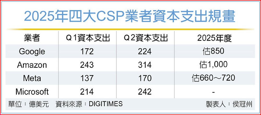 Google在2025年第一季、第二季的資本支出分別為172億美元、224億美元,今年全年資本支出預達850億美元;Meta第一季和第二季投入137億和170億美元,今年預計達660億~720億美元。亞馬遜第一、第二季分別投入243億美元、314億美元,今年資本支出預計高達1,000億美元;至於微軟第一季、第二季已投214億美元和242億美元,第三季資本支出預期將超過300億美元。