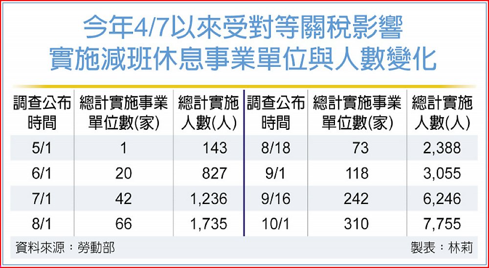 台美關稅談判效應持續擴大,勞動部1日公布最新減班休息統計顯示,本期共有398家企業通報、影響人數8,505人,較上期(按:9月16日公布)增加65家、1,171人。其中,受對等關稅衝擊的企業達310家,影響人數7,755人,占總數約九成。