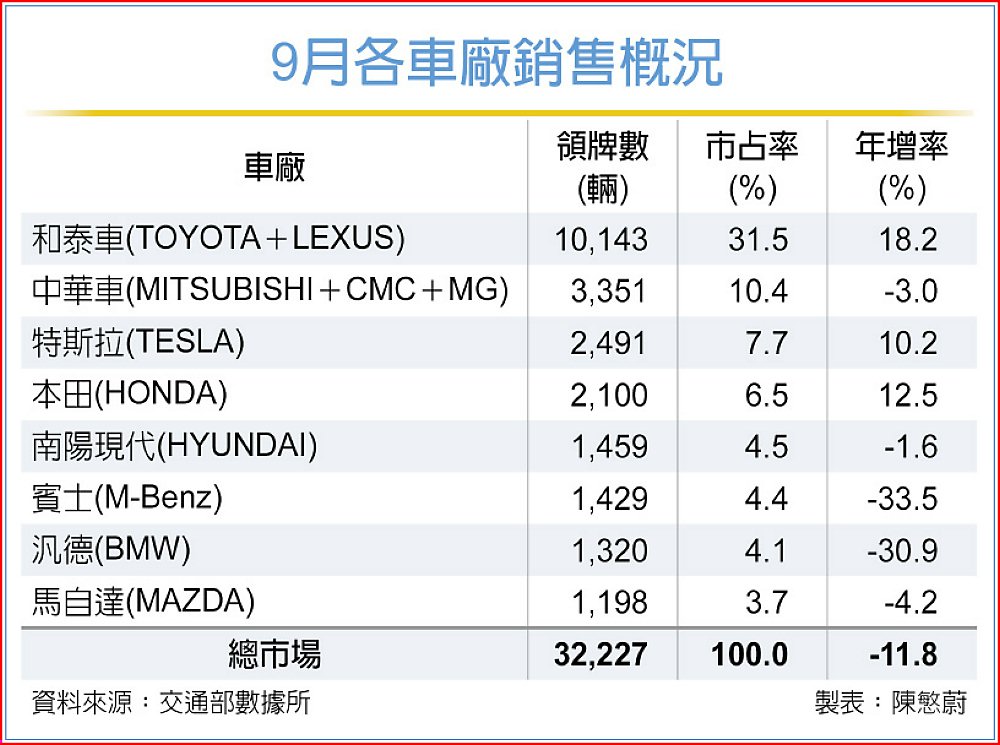 不過,多數品牌受惠雙稅議題逐步明朗,9月交車數字皆較8月有所成長,台灣本田、特斯拉更是9月「唯二」年月雙增品牌,豪華車品牌9月交車量月增11.1%~94%不等,其中賓士及BMW分別月增65%與29.5%。