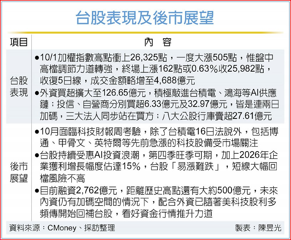 台股1日延續反彈氣勢,加權指數一度大漲505點至26,325點,惟因美國政府即將關門,盤中高檔調節力道加大,靠護國神山台積電收漲20元支撐下,大盤終場上漲162點收25,982點,雖未能站穩26,000點整數關卡,但順利收復5日線,成交量略增至4,688億元。法人看好多方架構不變,緩漲格局顯示籌碼良性換手,有助指數穩步墊高,加上台指期夜盤一度漲逾250點,2日加權指數再戰26,000點。