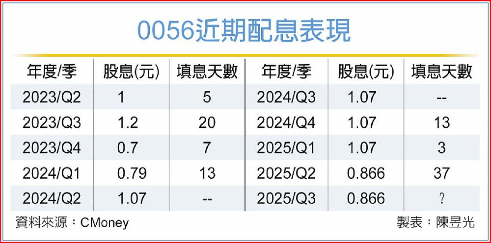 元大投信官網顯示,0056至9月30日帳上包含股息收入的可分配收益5.15元、包含資本利得的資本平準金6.77元,第三季以來分別成長5.7%、47.5%。反映台股企業營運成長,0056的股息金額長期呈現增長趨勢,2024年全年配息3.63元已是成立初期的兩倍以上,如本次實際配息金額未調整,將再超越2024年。