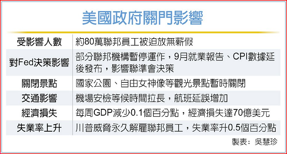 部分聯邦部門暫停運作,原定本周五(3日)出爐的9月非農就業報告暫停發布,15日的消費者物價指數(CPI)也可能延後,聯準會欠缺重要數據參考,可能影響28~29日例會決策。