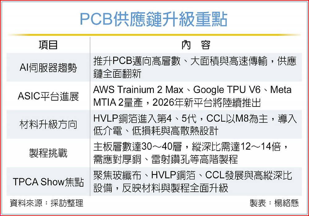 AI伺服器推升PCB邁向高層數、大面積與高速傳輸新門檻,材料與製程升級迫在眉睫。隨著NVIDIA、AWS、Google等自研晶片平台密集放量,供應鏈從銅箔、基板到加工技術全面翻新。TPCA Show將於10月22日登場,聚焦HVLP銅箔、玻纖布選型與高縱深比製程等新世代需求,業界也加速卡位新材料與海外產能。