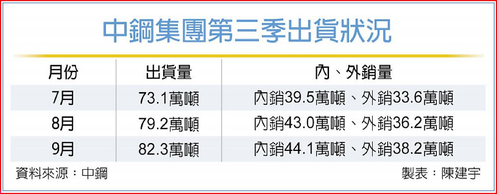 中鋼集團9月的出貨量達82.3萬噸,比目標值80萬噸多2.3萬噸,相隔三個月後重新站上80萬噸大關,第三季持續呈現復甦的趨勢。
