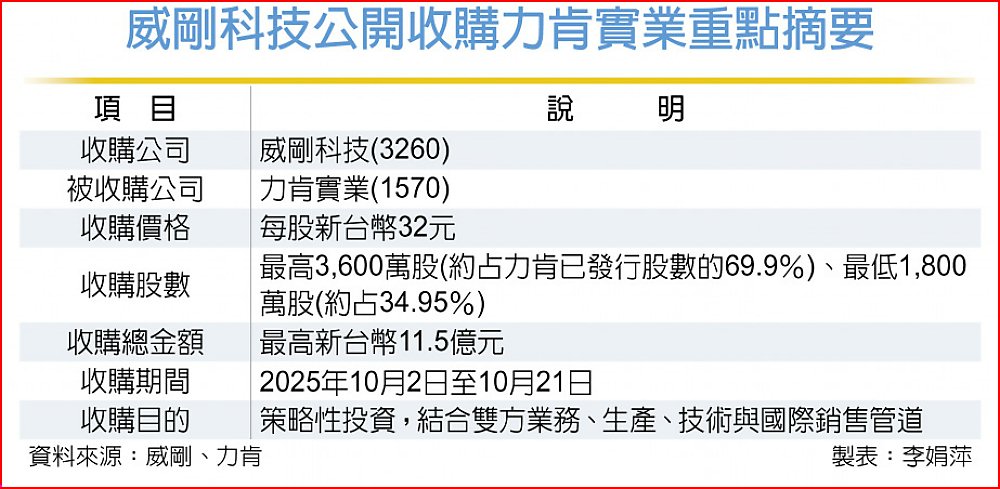 記憶體模組大廠威剛科技(3260)1日召開董事會,決議通過以每股32元,公開收購台灣專業氣動工具製造廠力肯實業(1570)普通股,最高收購數量3,600萬股,相當於力肯已發行股數的69.9%;最低收購數量為1,800萬股,約34.95%。