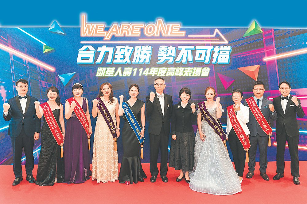 凱基人壽昨(1)日盛大舉辦 「WE ARE ONE 合力致勝 勢不可擋」114年度高峰表揚會,隆重表揚在業績突破、組織領導及團隊經營上表現卓越的菁英們。凱基金控暨凱基人壽董事長王銘陽、總經理郭瑜玲肯定同仁卓越的成績,更感謝全體團隊以永不設限、勇於突破的精神,共同寫下凱基人壽的高峰榮耀。