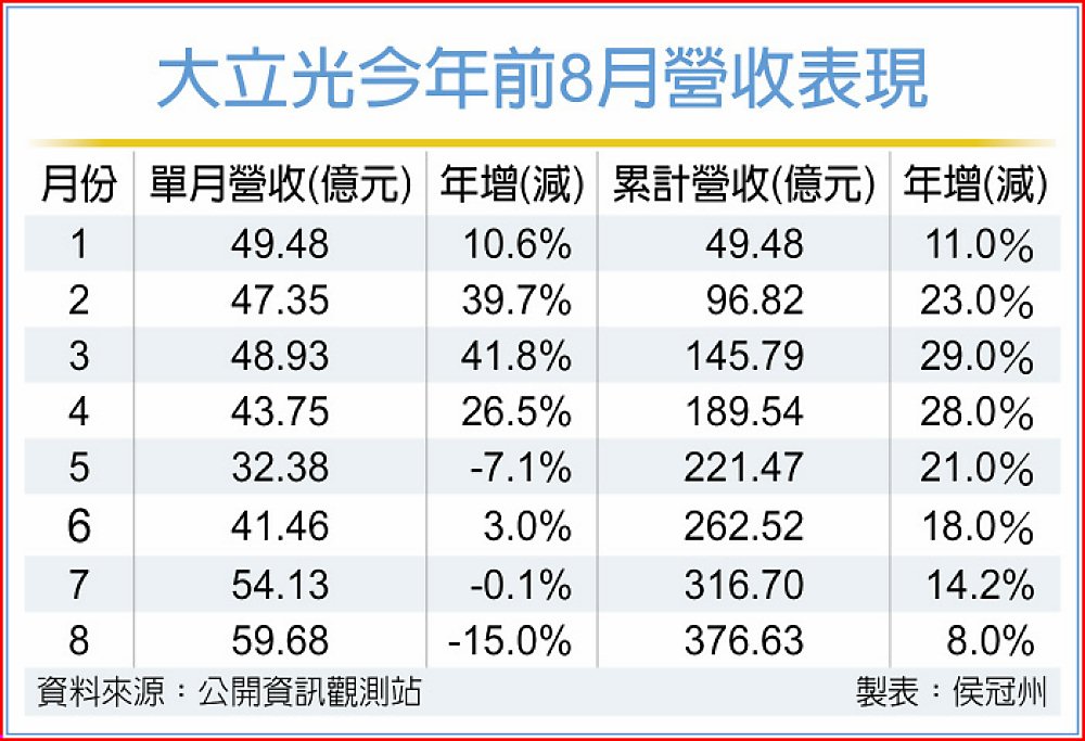 大立光將於5日公布9月營收,屆時也將釋出10月營運展望,公司先前表示,9月出貨動能優於8月表現。