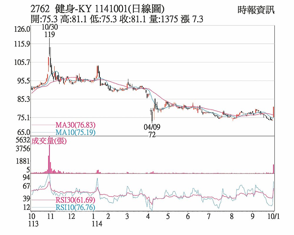世界健身-KY(2762)法說釋利多,樂看第三季營收,1日在外資與自營商買超帶動下,開盤不到半小時就衝上漲停價,隨後因賣壓湧現,漲停打開,但仍在漲停與高檔之間震盪整理,上午10時18分再度攻上漲停價,之後幾乎在漲停價上下游走,午盤直攻漲停價81.1元鎖住至終場,上漲7.3元,成交量1,359張,創6月10日以後股價新高。外資及自營商持股比重分別為82.41%、0.03%,加上委買788張,委賣掛零,若主力及中實戶力挺,股價仍有上漲空間。前八月營收71.38億元、年增10.58%。