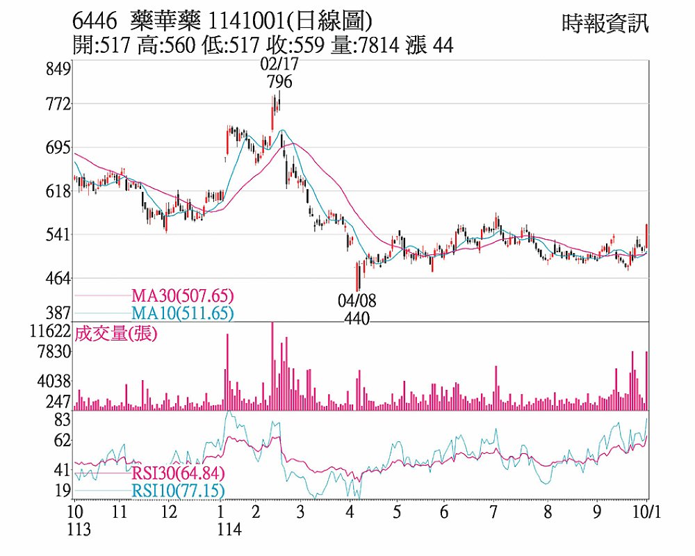 藥華藥 (6446)為因應美國關稅政策,將加快建置Ropeg美國產線腳步,加上治療原發性血小板過多症(ET)新適應症也規畫年底前向FDA提出藥證申請,激勵1日股價大漲8.54%,以559元站回5日線及半年線,成交量7,481張,其中外資買超2,080張。