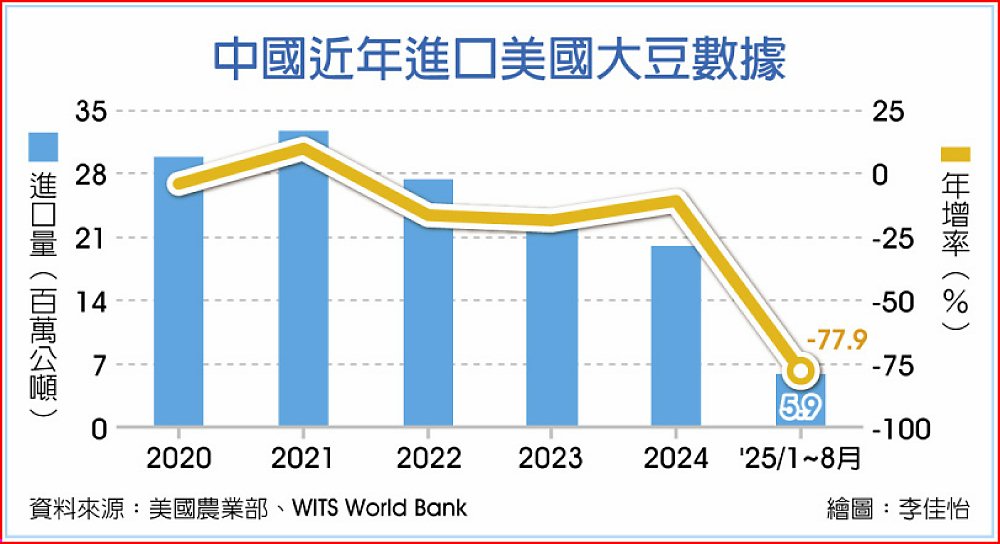 美國農業部數據顯示,截至9月18日,中國在新行銷年度尚未預定美國大豆,這是自1999年有紀錄以來首見。去年,美國供應中國約五分之一所需大豆,價值逾120億美元,占美國大豆出口總值一半以上。