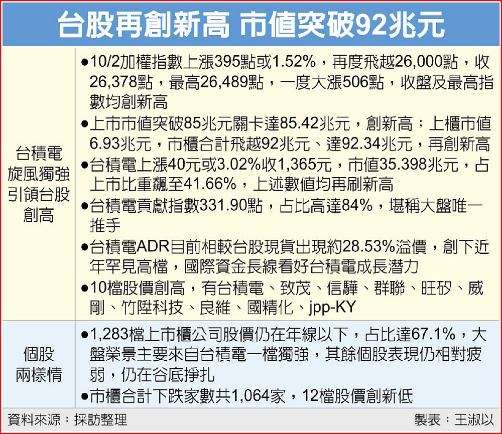 外資稱台積電是AI黃金時代的最大受惠者,帶動2日盤中勁揚至1,370元、終場大漲40元收1,365元,市值衝上35兆3,980億元,占上市比重高達41.66%,全數改寫新高;單日貢獻大盤331.90點,占比高達84%,堪稱行情唯一推手;台積電ADR目前相較台股現貨出現28.53%溢價,創下近年罕見高檔,反映國際資金對台積電長線成長潛力的強烈信心。