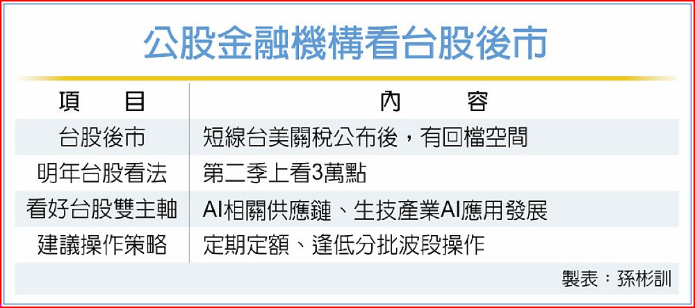 台股近期表現強勁,常配合政策協助穩定股市的公股行庫,對後市的研判也偏向樂觀。包括臺灣企銀等公股銀行近期對台股的內部評估顯示,對後市表現樂觀,預計台美關稅公布後短線利多出盡,指數有15%~20%回檔空間,一但修正後將於12月重啟攻勢,台股長多未變格局未變,預估明年第二季間,加權股價指數有機會上看3萬點。