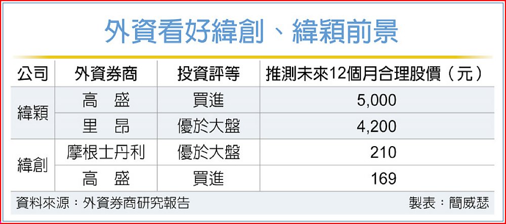 緯創受惠AI伺服器動能強勁,股價近期表現剽悍,摩根士丹利證券最新將其列為投資首選(Top Pick),股價預期上看210元,寫下新紀錄;同集團高價指標股緯穎即將挑戰新高,高盛證券賦予的推測合理股價甚至高達5,000元,里昂也調升至4,200元,獲利成長性格外引人注目。