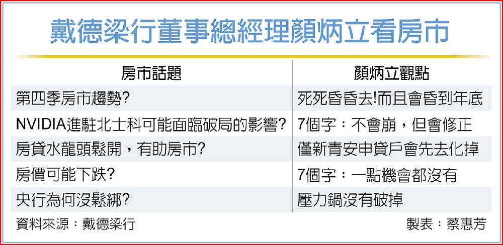 邁向第四季之際,戴德梁行董事總經理顏炳立2日表示,政策限貸影響下,今年房市已大勢已去,預期至年底,房市都是「死死昏昏去,而且會昏到年底!」直言房市會冷到年底,明天不會更好。