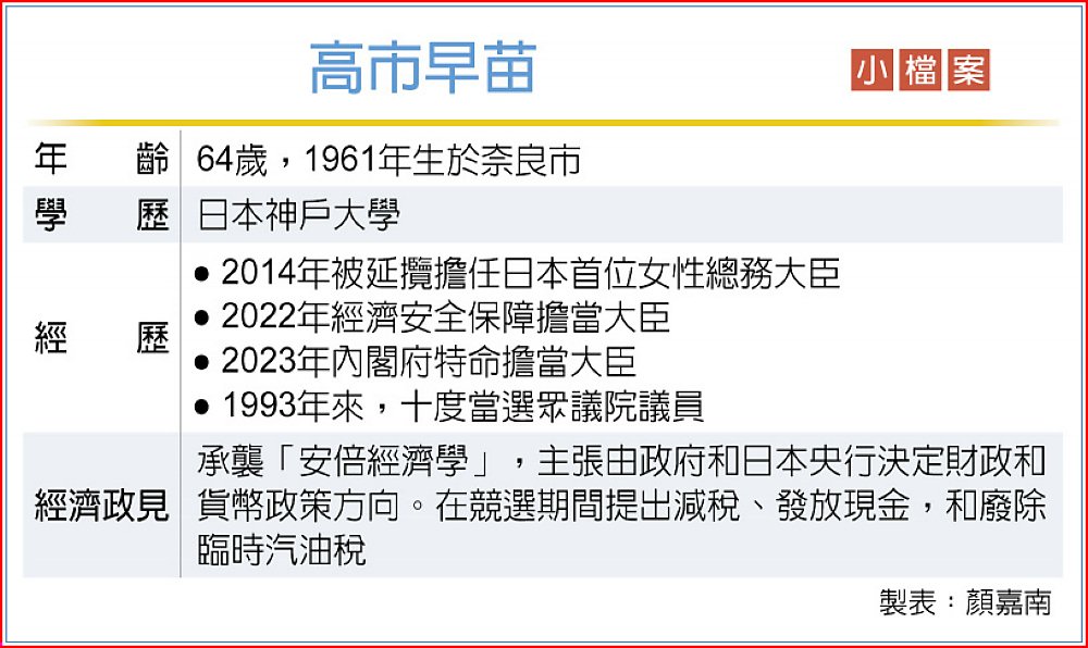 高市在9月正式宣布競選自民黨總裁,她承諾制定總體計畫,讓日本經濟規模在10年內翻升一倍。她表示:「我從未否認『財政重整』(fiscal consolidation)的必要性,但最重要的事情在於經濟成長。我會讓日本再度成為充滿活力的旭日東昇之地。」