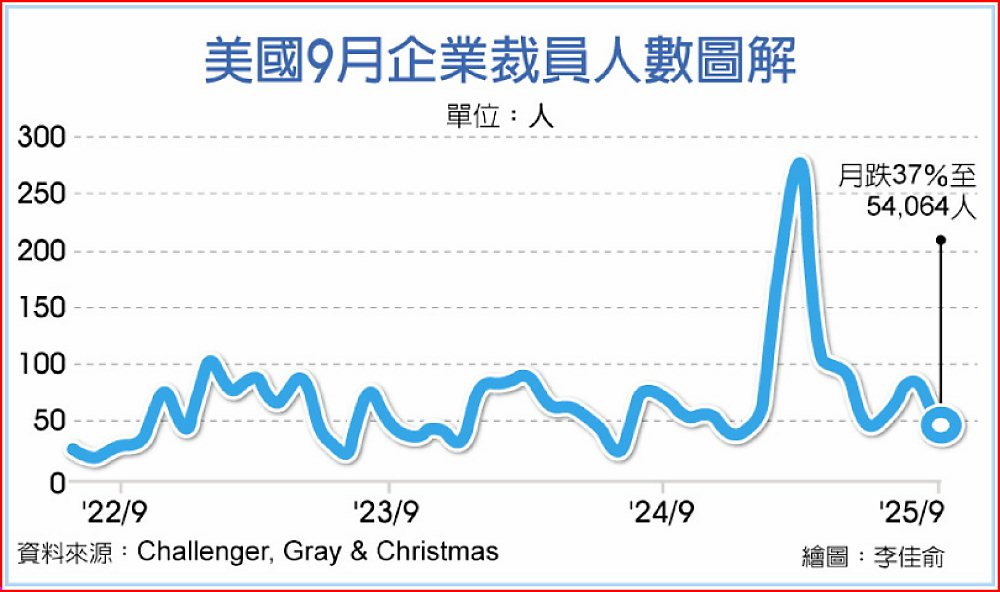 今年來裁員數最高的是政府部門,截至9月底止累計宣布裁員299,755人,當中幾乎是由「政府效率部」(DOGE)操刀。裁員第二高是科技業,累計107,878人,較去年同期減少8%。第三高是零售業,年增203%至86,233人。