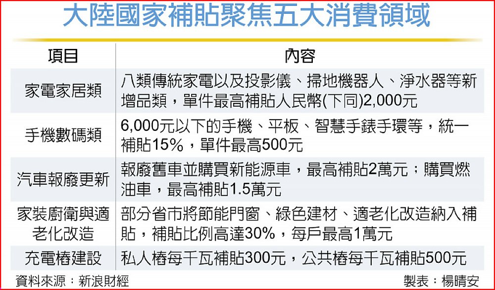 進入「金九銀十」傳統旺季,大陸加大刺激內需消費。官方搶在「十一」黃金周前夕推出規模人民幣(下同)690億元的第四批國家補貼(國補),聚焦五大消費領域,再加上緊接而來的「雙11」電商大促,雙重優惠疊加有望帶動買氣。