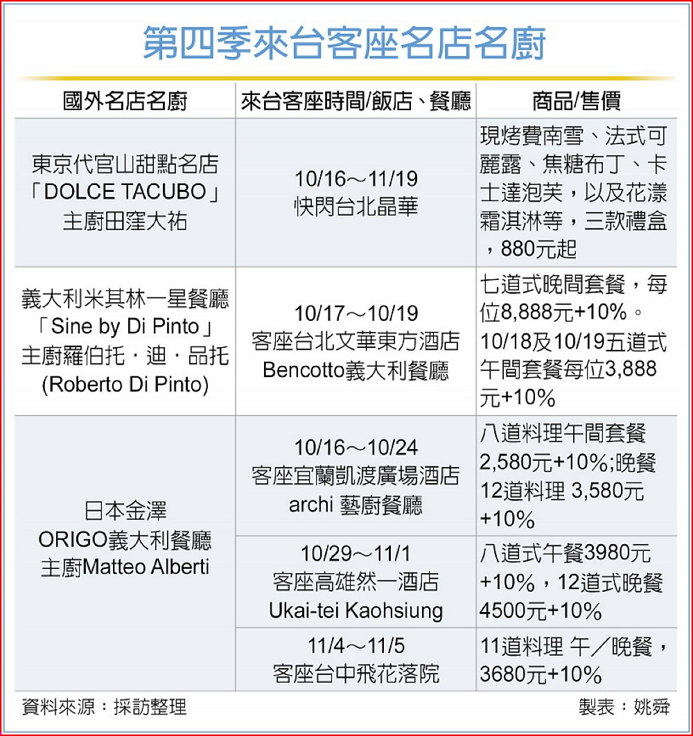 為了提高品牌聲量與能見度,並搶攻第四季的餐飲業績,台北晶華、文華東方、宜蘭凱渡廣場、高雄然一等酒店,及台中高級餐廳飛花落院,分別自日本與義大利請來米其林餐廳或名店名廚快閃客座,掀起市場搶客大戰。