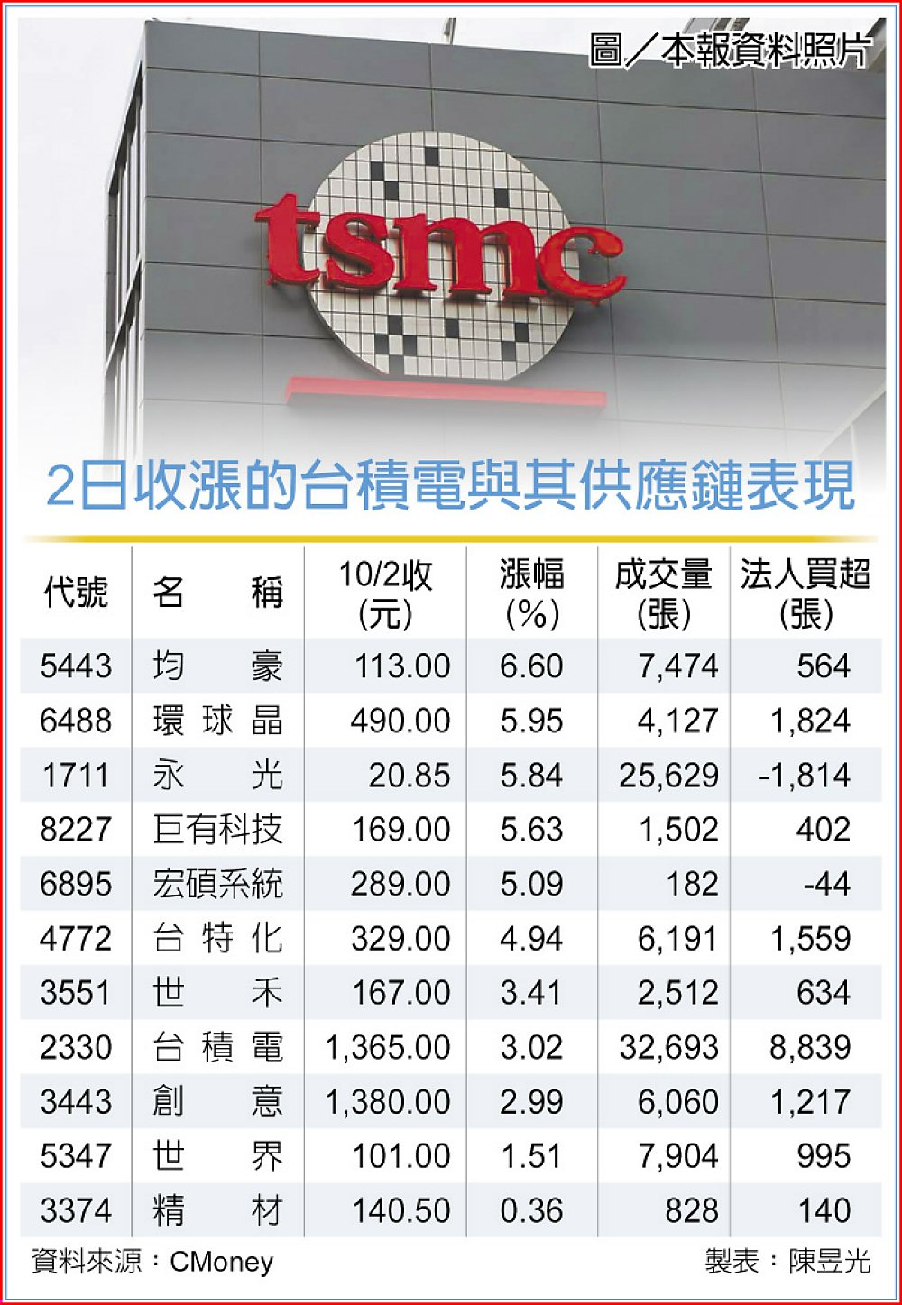 台積電2日股價上漲3.02%,收在1,365元,再度刷新歷史天價,法人解讀為16日法說會提前暖身,帶動供應鏈跟進,包括均豪收漲6.6%,環球晶收高5.95%,永光上揚5.84%,巨有科技收漲5.63%,宏碩系統上漲5.09%,皆漲逾半根停板。