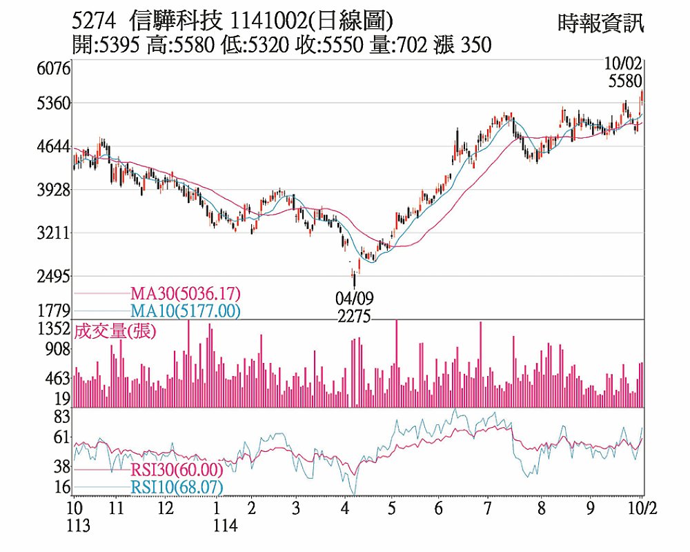 信驊2日股價再寫歷史新高,盤中觸及5,580元,終場收5,550元、漲幅6.73%,穩居股王寶座。均線持續攻堅,表現強勢。法人看好,信驊長期動能來自AI伺服器對BMC、BIC等周邊晶片需求擴大。