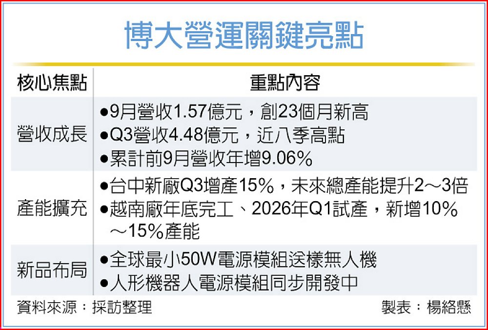 電源模組廠博大(8109)營運動能續揚,9月合併營收1.57億元,月增7.63%、年增29.81%,創下23個月來新高,推升第三季營收達4.48億元,季增2.7%、年增16.9%,為近八季高點;累計前九月營收12.76億元,年增9.06%。隨訂單能見度已延伸至2026年首季,並搭配台中與越南兩地新產能陸續開出,全年營運有望持續增長。