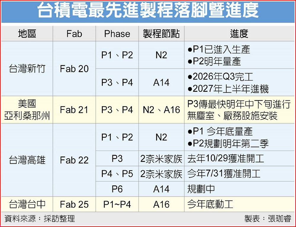 美國亞利桑那州廠則預計在P3、P4導入2nm/A16。根據目前廠務工程業者評估,儘管速度正在加快,但P3廠最快明年中下旬才會開始進行無塵室、水電系統等施作,因此2028年前要在美國大量生產2奈米難度高。相較之下,高雄建廠進度明顯領先,未來可望成為台積電2奈米以下製程的全球核心樞紐。(相關新聞見A3)