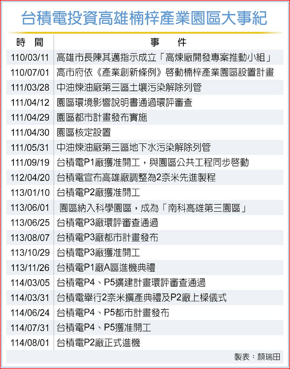 陳其邁表示,台積電進入建廠階段之後,高市府與廠方採取「全天候對接」模式,確保投資順利推進,楠梓產業園區的公共建設與建廠,同步進行,涵蓋道路、污水、再生水、排洪、景觀及公共設施等工程,高市府也在行政程序、執照核發、環評及都計變更等面向,積極協調,使各項審查順利銜接。