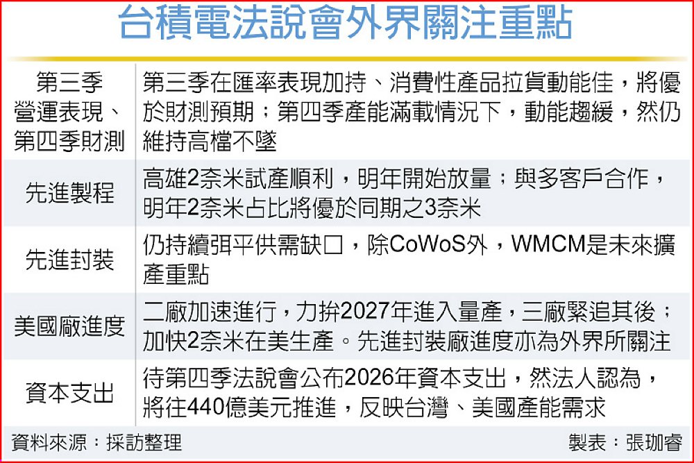 晶圓代工龍頭台積電第三季營收可望首度突破兆元大關,創下歷史新高,展現AI與先進製程的強勁需求。公司將於10月16日召開法說會,市場聚焦AI晶片動能、先進製程與美國建廠進度。法人指出,台積電在輝達、蘋果等主要客戶持續加單帶動下,營運暢旺將一路延續至明年第二季。