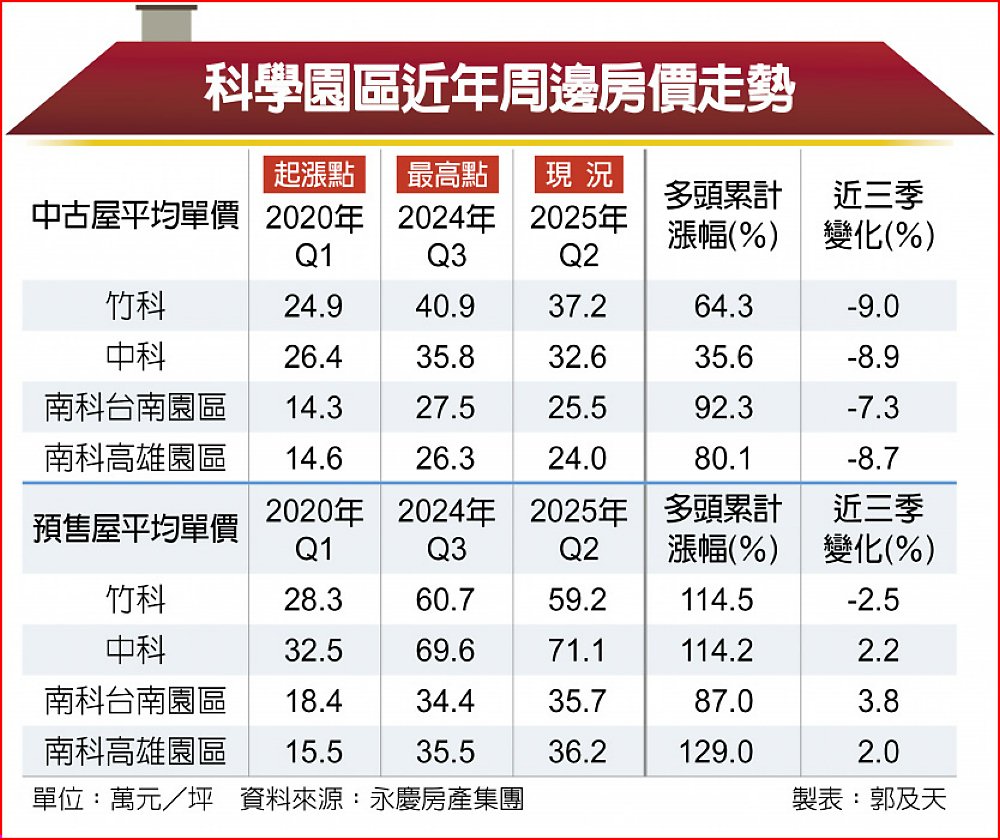 永慶房產集團統計各大科學園區周邊房市近年量價,自去年第四季至今年第二季中古屋成交量,較信用管制前減少39.4%~54.9%,預售屋成交量較信用管制前大減66.9%~78.6%。