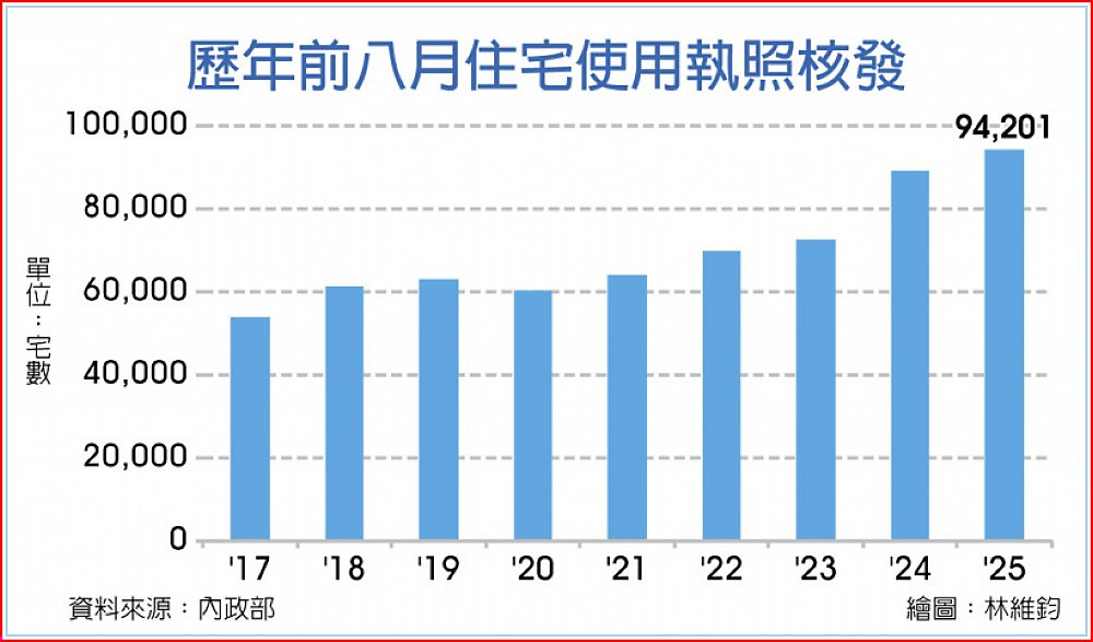 即便房市低迷,但新建案交屋海嘯仍持續堆疊。據內政部最新統計,今年1月至8月累計住宅使用執照核發數量高達94,201宅,不僅連續兩年創下同期統計新高,自2020年以來已連續五年攀升,主要受惠過去大量預售建案陸續完工;不過,今年1月至8月核發的住宅建築執照數量則創下近五年同期低點,反映當前市場前景不明、開發商趨向縮手觀望。