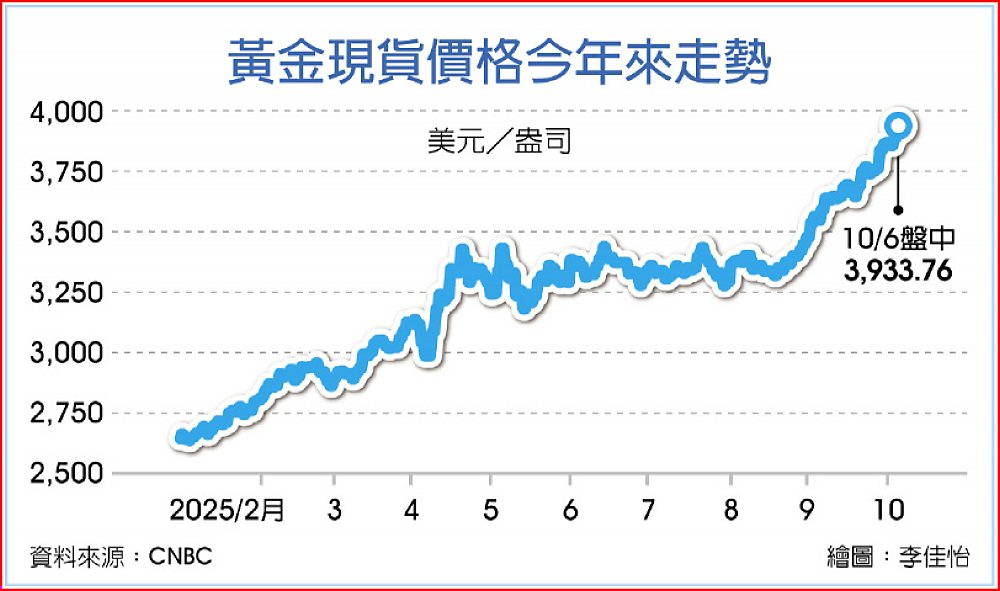黃金價格6日衝破3,900美元,今年迄今漲幅逼近50%。原因是美國政府停擺、經濟不確定性擴大,加上市場預期美國聯準會(Fed)可能進一步降息,促使投資人湧入避險資產。
