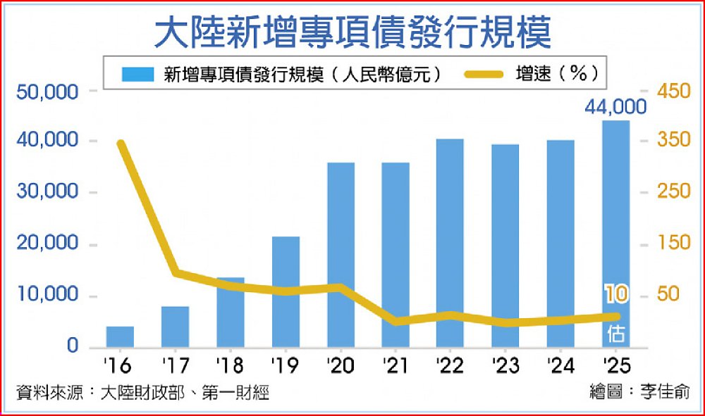 第一財經報導,大陸財政部數據顯示,自2015年首次發行新增專項債以來,規模持續擴大。2025年新增發行規模預計達到人民幣(下同)4.4兆元,十年間增長近50倍。截至今年7月末,全國地方政府專項債務餘額約35.5兆元,占地方政府債務總額約67%。