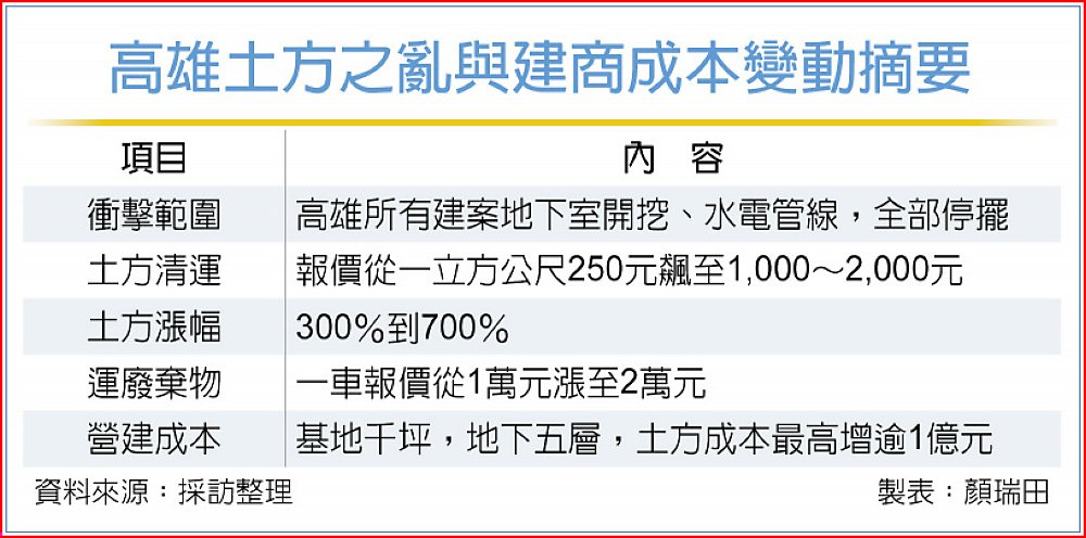 美濃「大峽谷」事件後,高雄營建土方和廢棄物面臨無處可去的危機,土方清運費從每立方公尺250元,直接飆漲至1,000~2,000元,清運成本因「土方之亂」飆升7倍,若再加上高雄容積移轉改採市價計算代金,未來轉嫁後,房價至少將上漲10%。