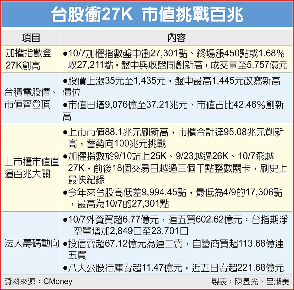 統計從9月10日加權指數攻上25K,至10月7日只花18個交易日,接連飛越26K及27K,寫下史上最快紀錄,從指數站上25,000點首日到10月7日止,市值躍增7.86兆元。